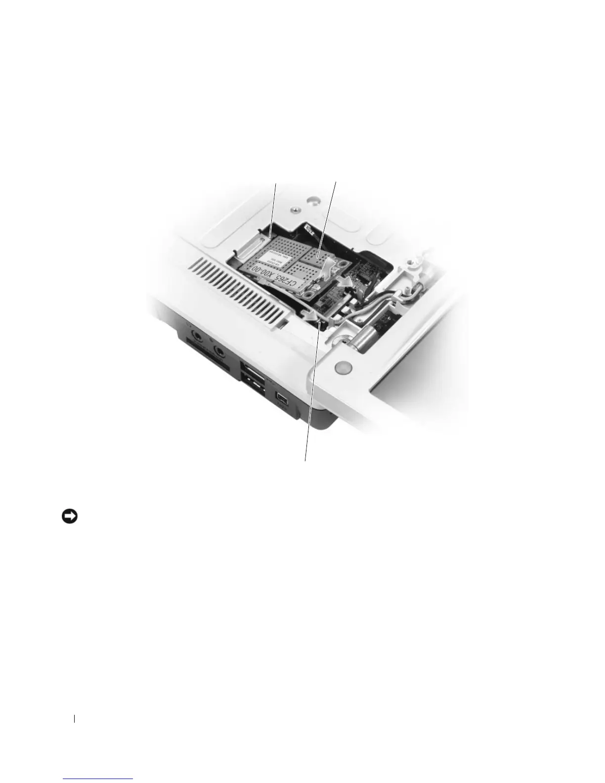 1 system board connector 2 Mini-Card 3 metal securing tabs (2)