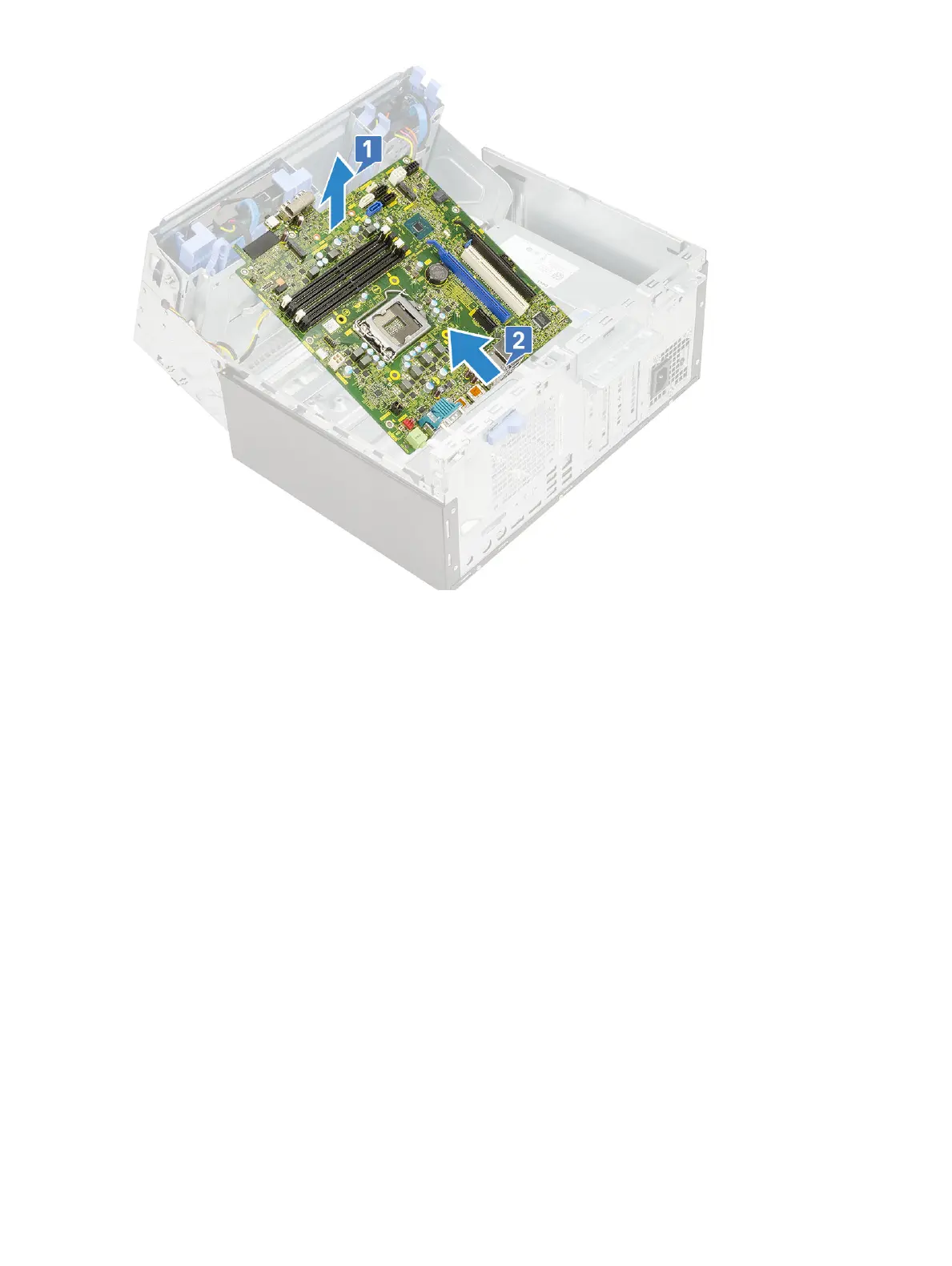 1 Hold the system board by its edges and align it towards the back of the computer.