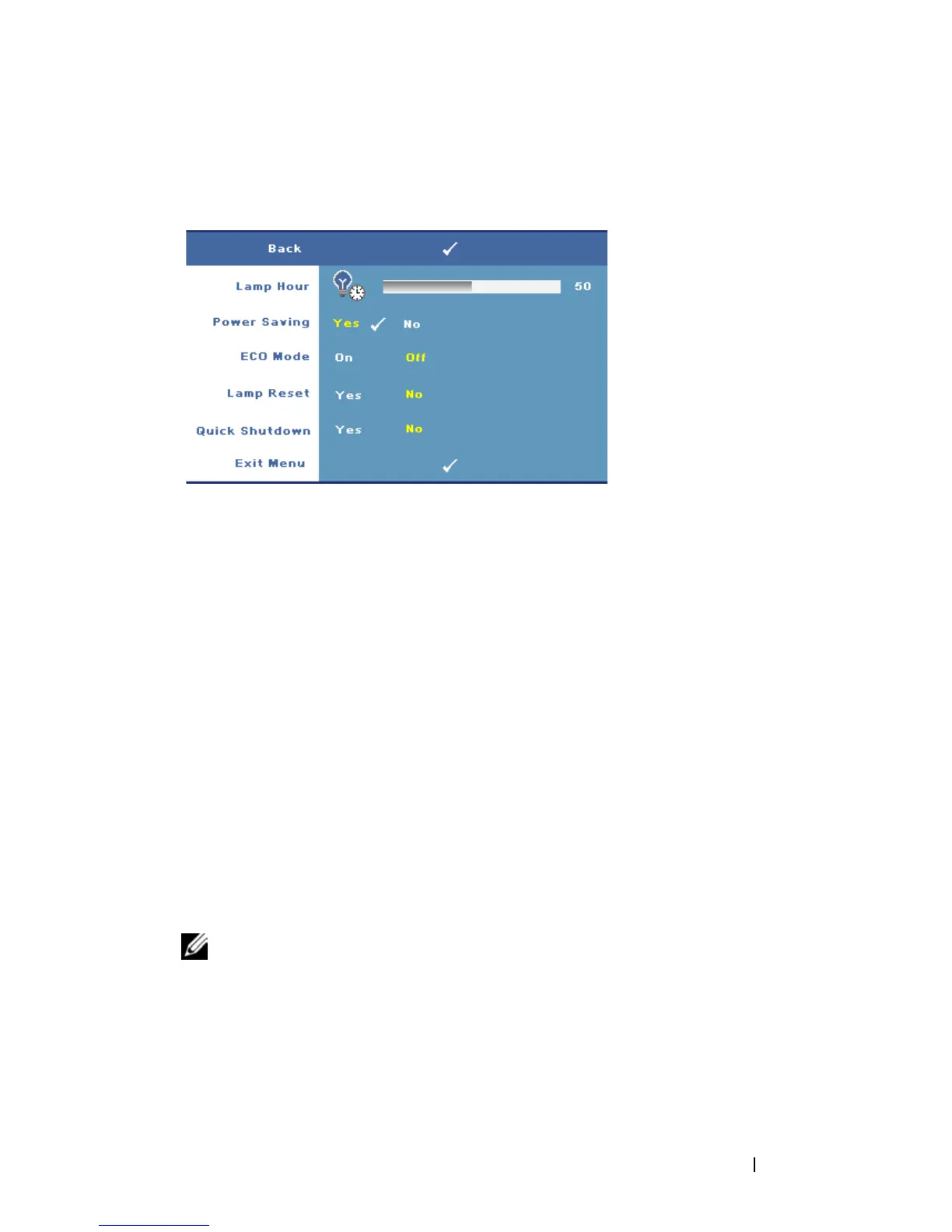 UICK SHUTDOWN—Select Yes to turn off the projector with a single press of the