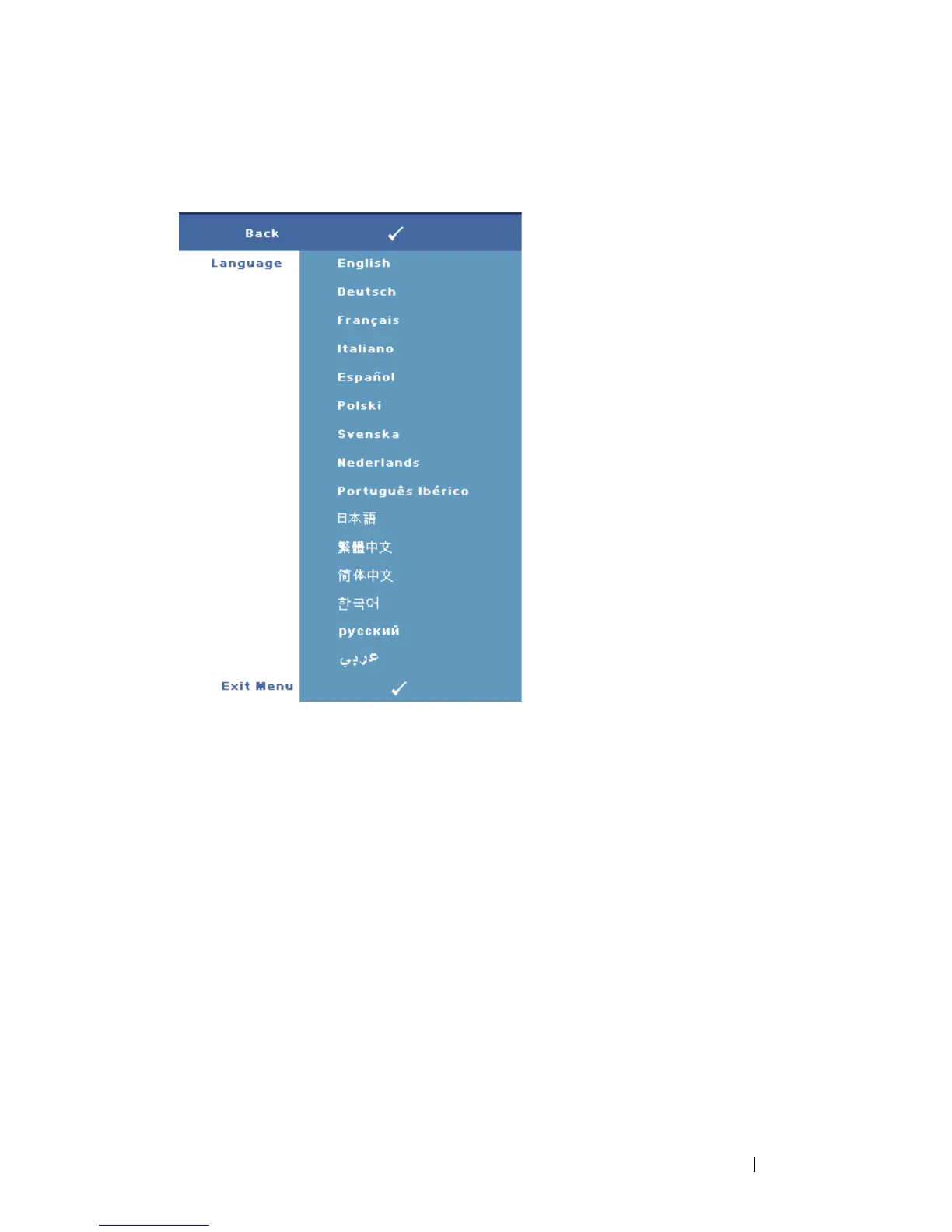 The Language menu allows you to set the language for the OSD.