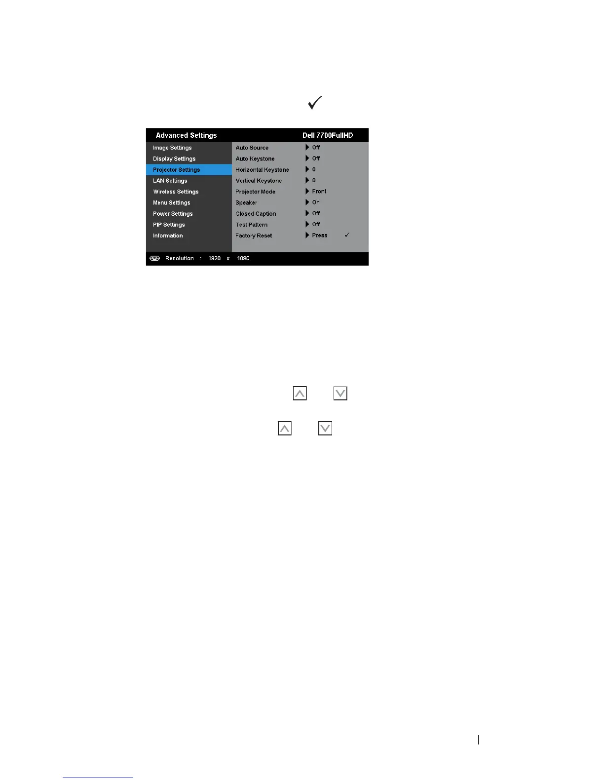 PROJECTOR SETTINGS—Select and press to activate projector settings. The