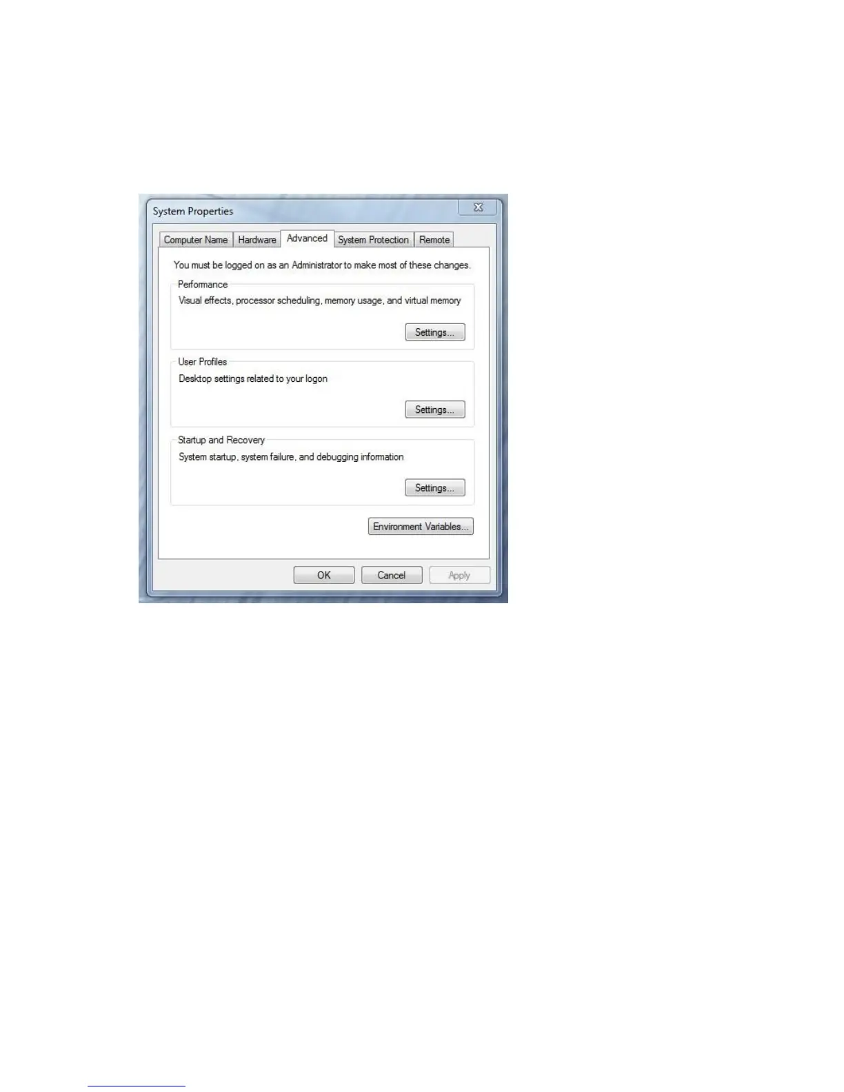 6. Under the “Advanced” tab depress the “Settings...” button for performance.