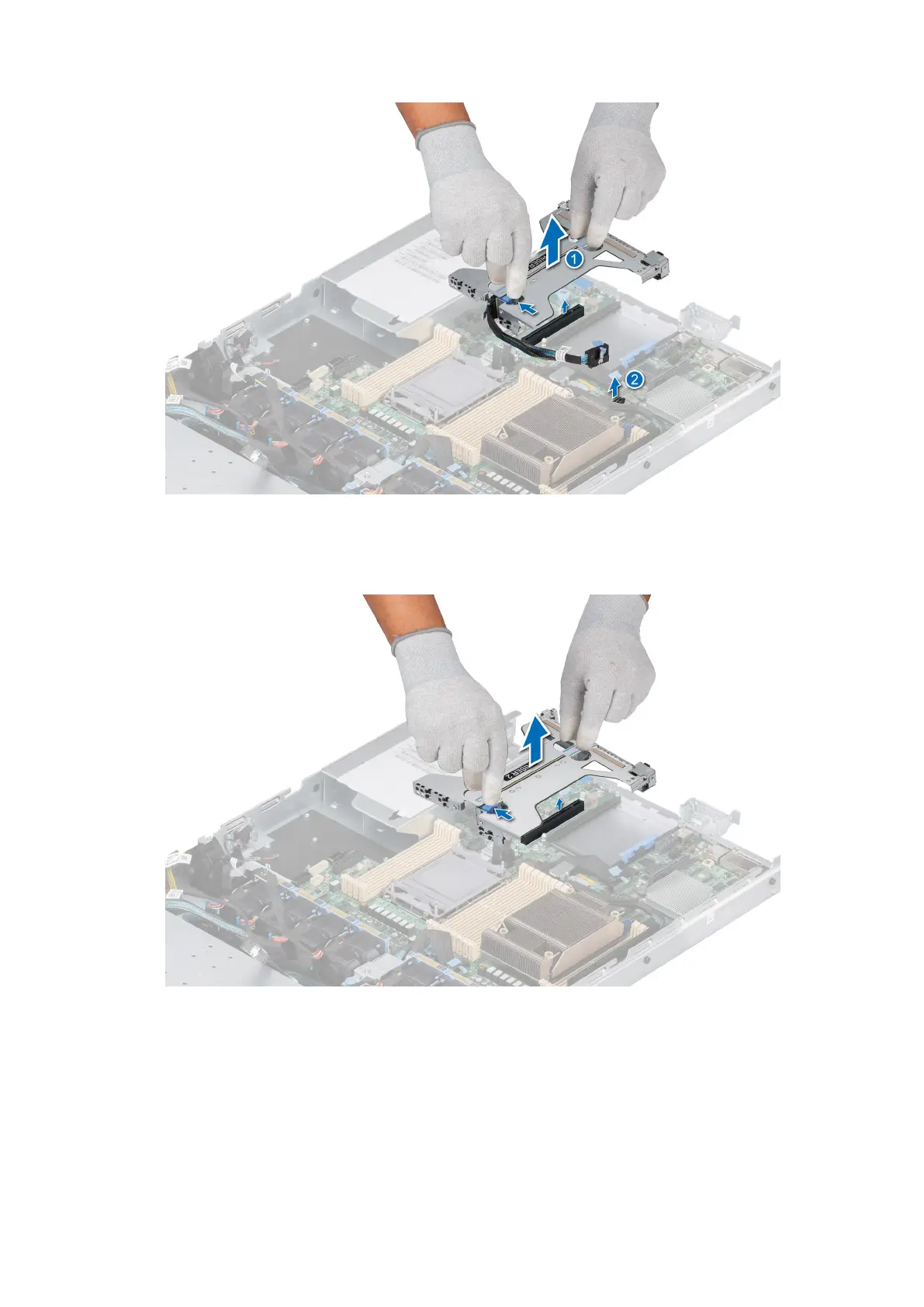 4. For Riser 2c, release the blue latch and hold the blue touch points, and lift the expansion card riser from the riser connector