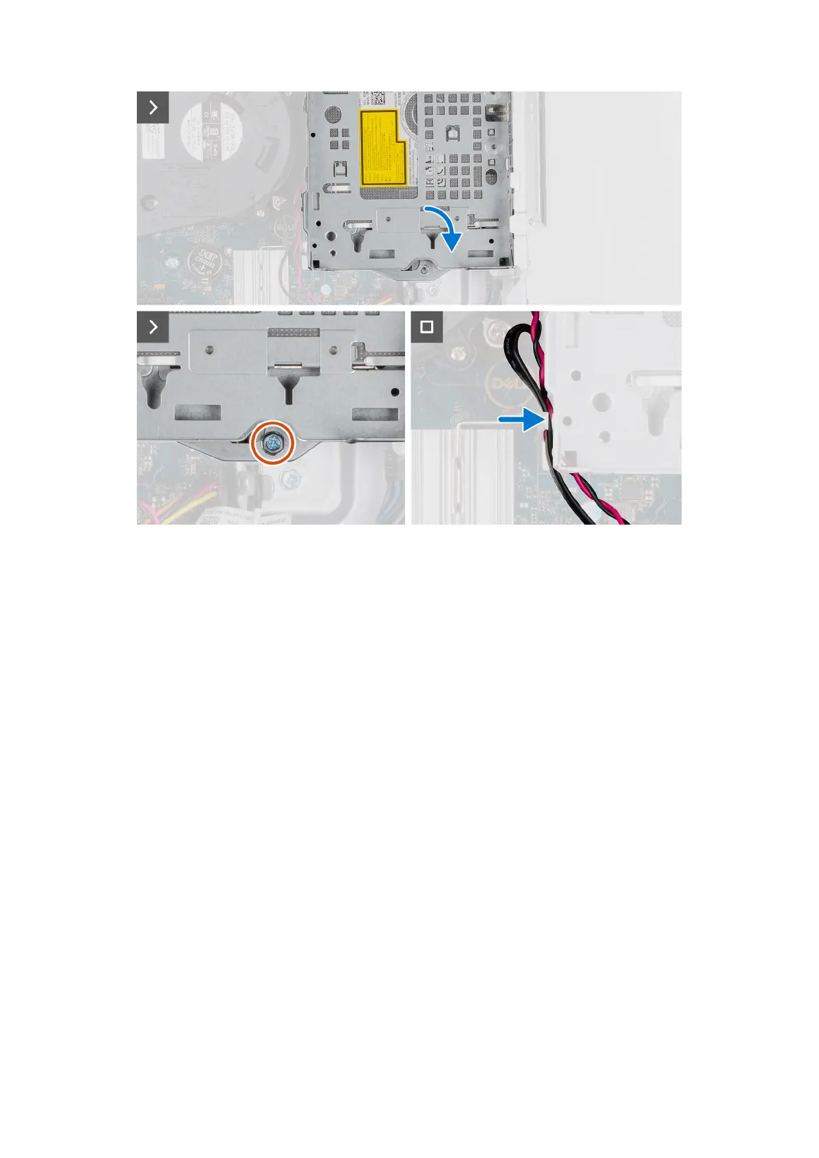 6. Se l'unità ottica è installata, instradare i cavi di alimentazione e dati dell'unità ottica attraverso la guida di instradamento sulla