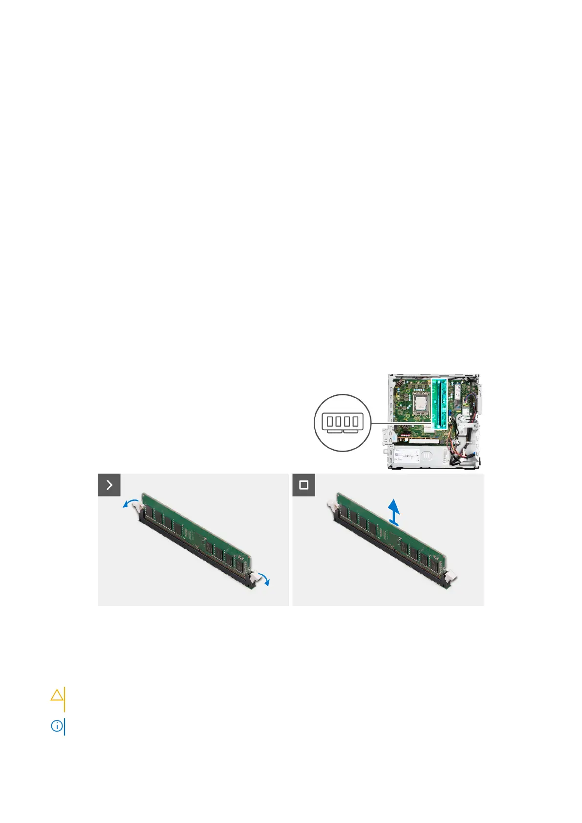 2. Afferrare il modulo di memoria vicino al fermaglio di fissaggio, quindi allontanarlo delicatamente fino a estrarlo dal relativo
