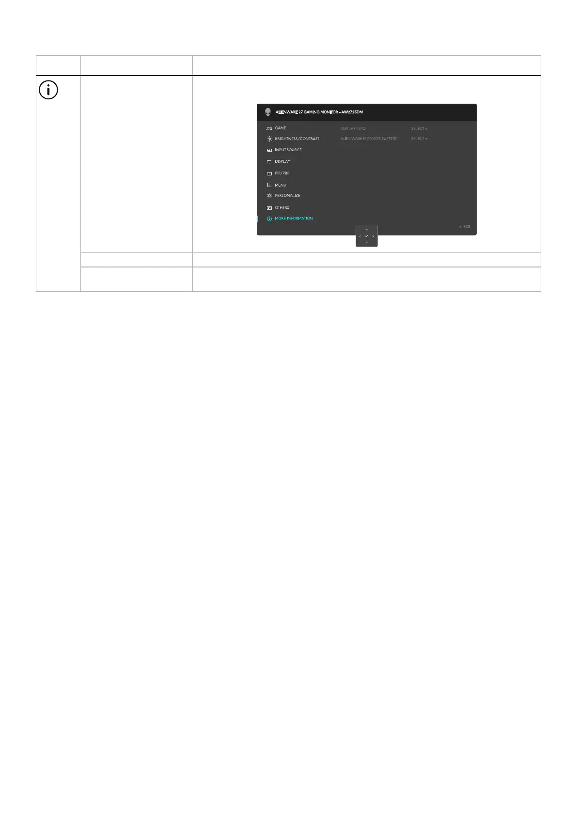 MORE INFORMATION Select this option for DISPLAY INFORMATION and ALIENWARE MONITOR