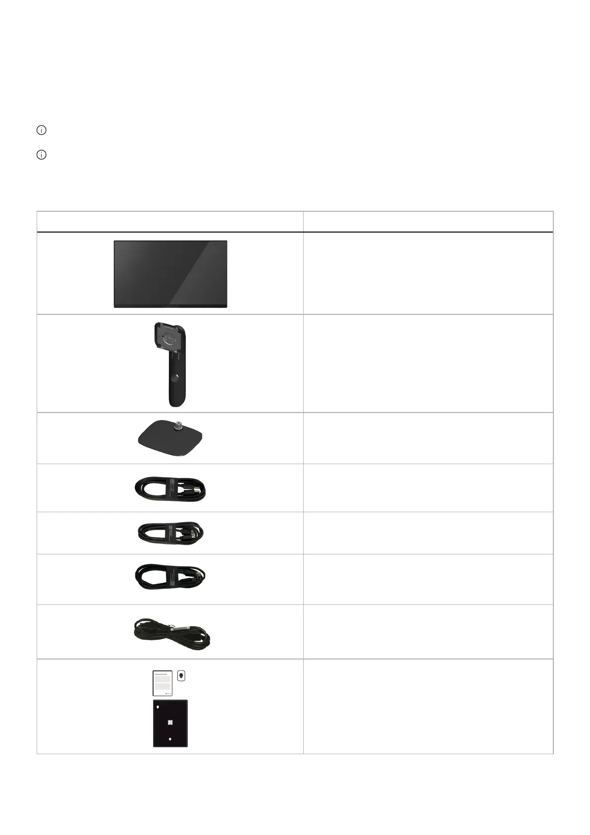 The following table provides the list of components that are shipped with your monitor. If any component is missing, contact Dell. For