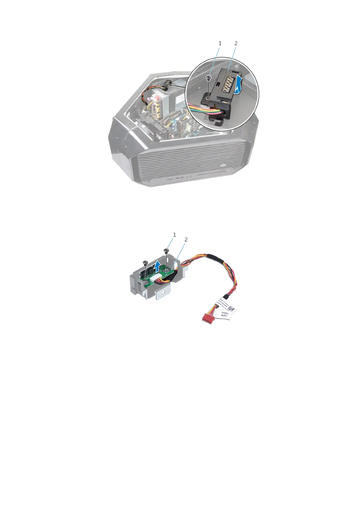 7. Remove the two screws (#6-32x6) that secure the AlienFX side-panel connector to the bracket.