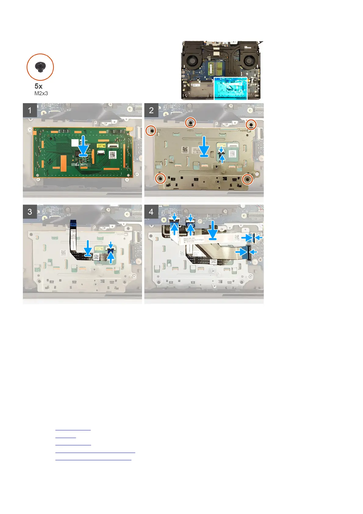 3. Replace the five screws (M2x3) that secure the touchpad bracket to the palm-rest assembly.