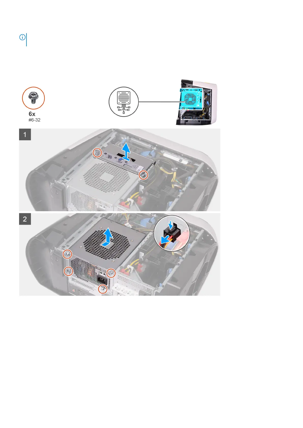 The following images indicate the location of the power-supply unit and provides a visual representation of the removal