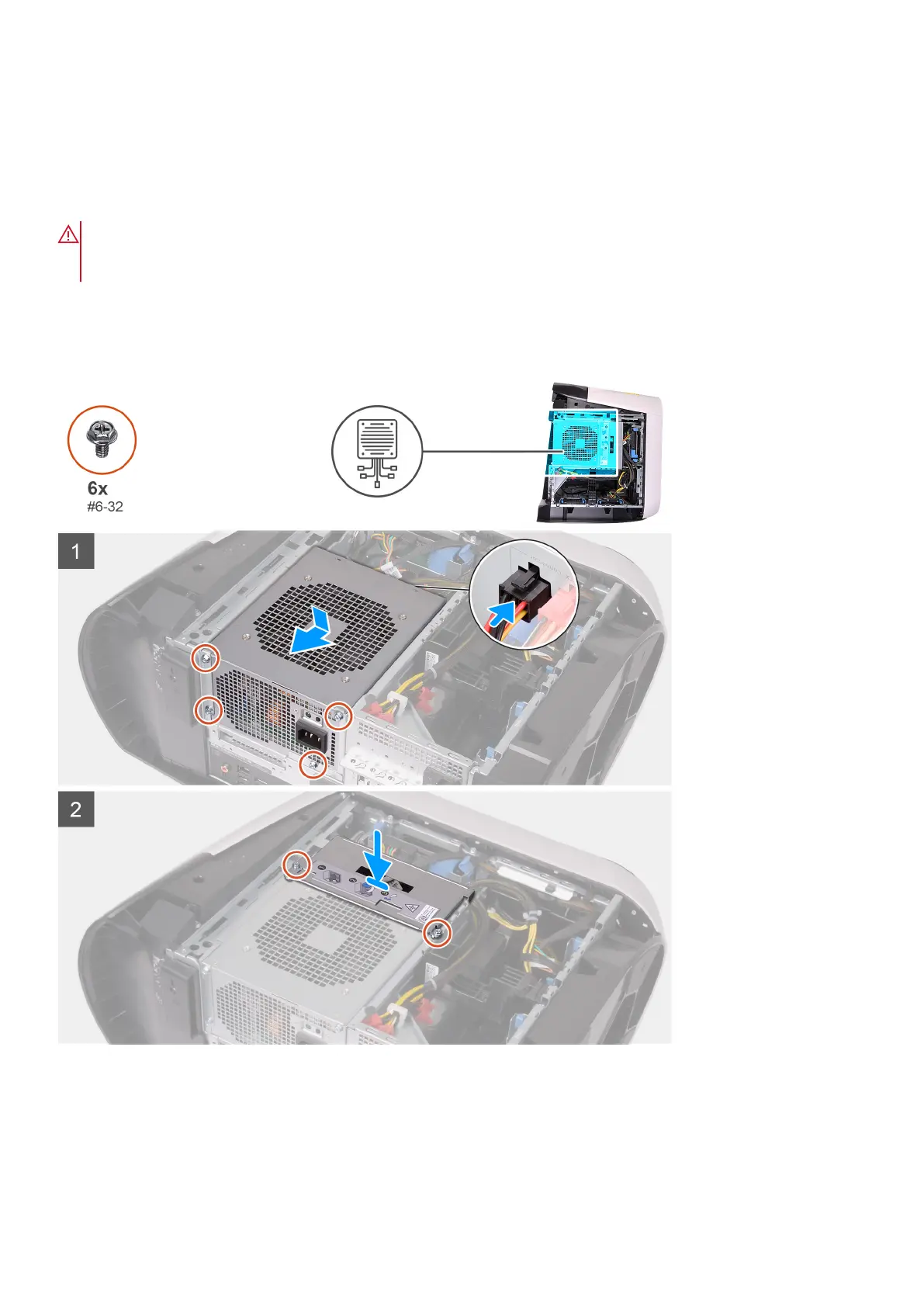 The following images indicate the location of the power-supply unit and provides a visual representation of the installation