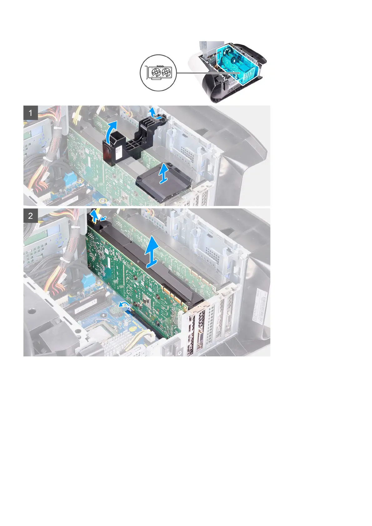 8. Push the securing tab on the PCIe slot away from the graphics card, grasp the card by its top corner, and ease it out of the slot on