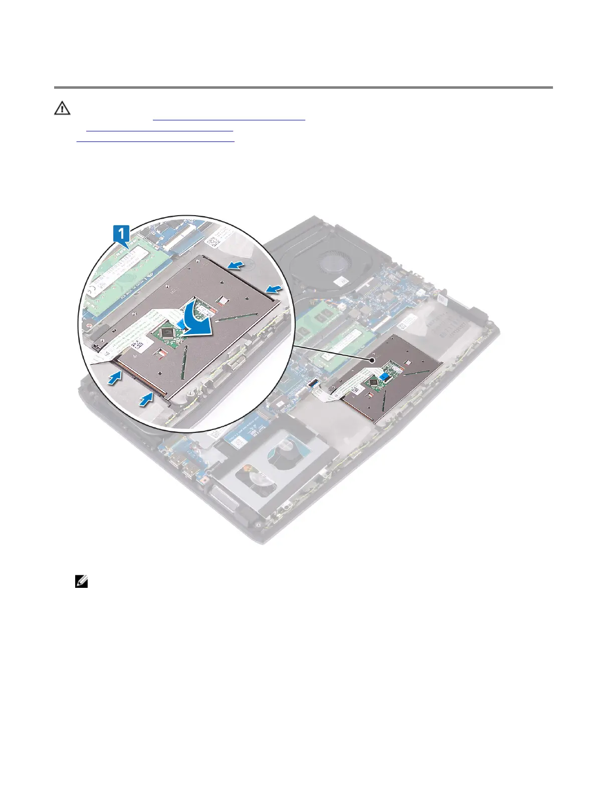 1 Slide and place the touchpad into the slot on the palm-rest assembly. Ensure that the touchpad is aligned with the guides