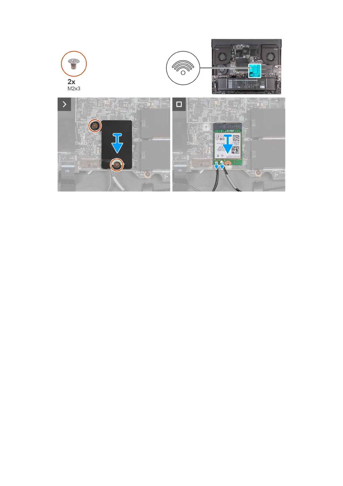 1. Remove the two screws (M2x3) that secure the wireless-card thermal shield to the wireless card and palm-rest and keyboard