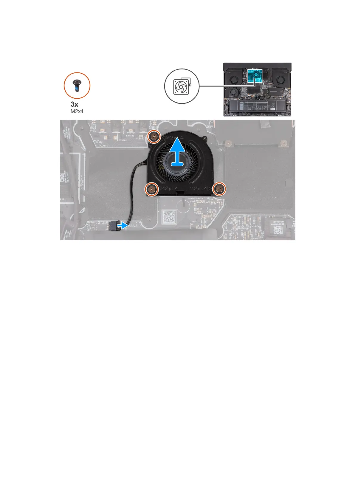 2. Remove the three screws (M2x4) that secure the fan to the palm-rest and keyboard assembly.