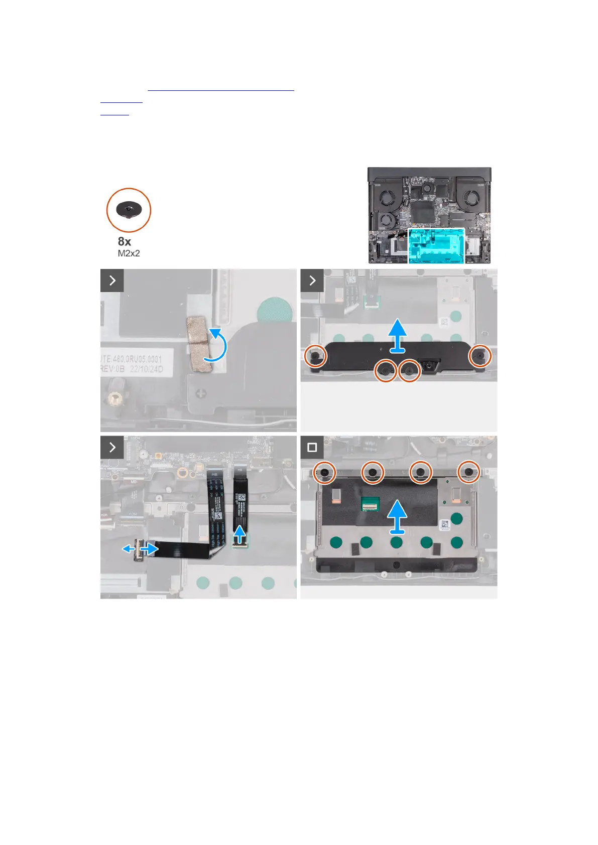 6. Remove the four screws (M2x2) that secure the touchpad to the palm-rest and keyboard assembly.