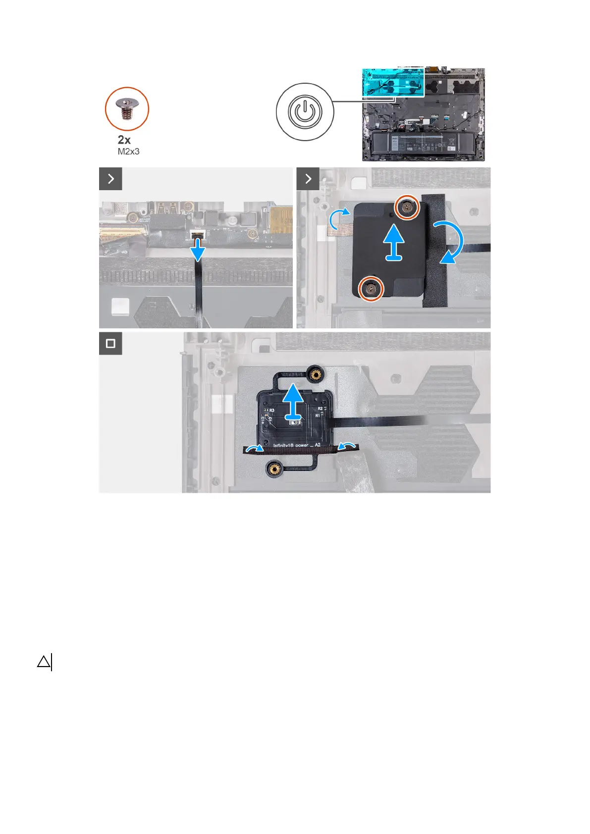 2. Remove the two screws (M2x3) that secure the power-button bracket to the palm-rest and keyboard assembly.