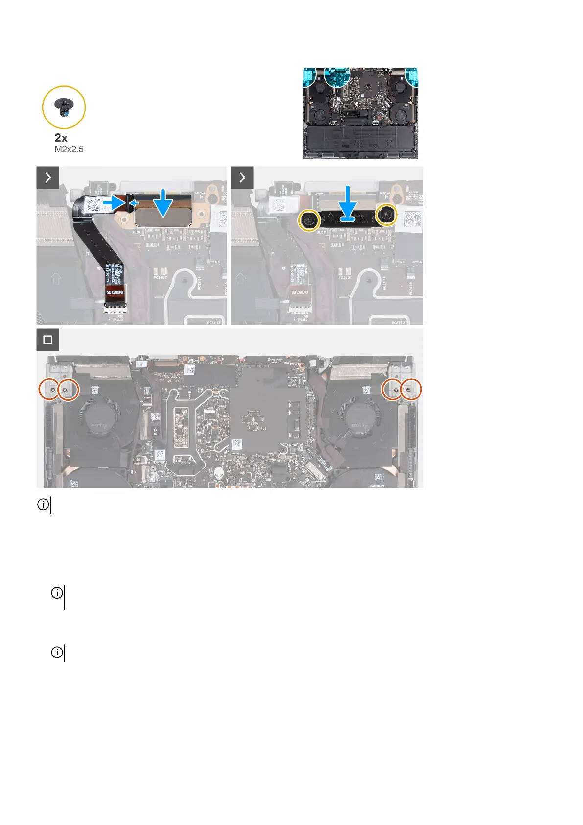 4. Replace the four screws (M2.5x4) that secure the left and right display hinge to the top side of the palm-rest and keyboard