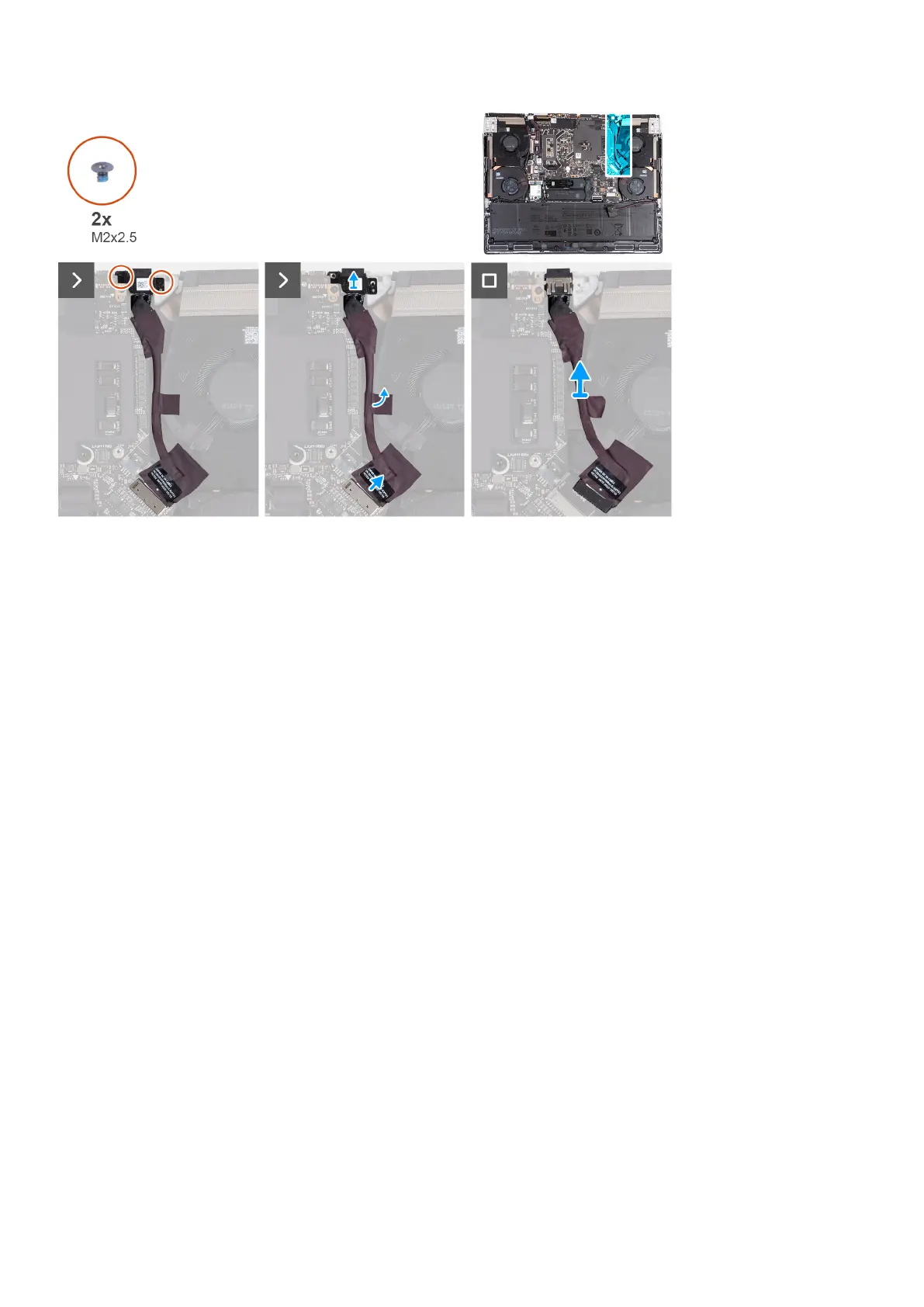 1. Remove the two screws (M2x2.5) that secure the power-adapter port bracket to the palm-rest and keyboard assembly.