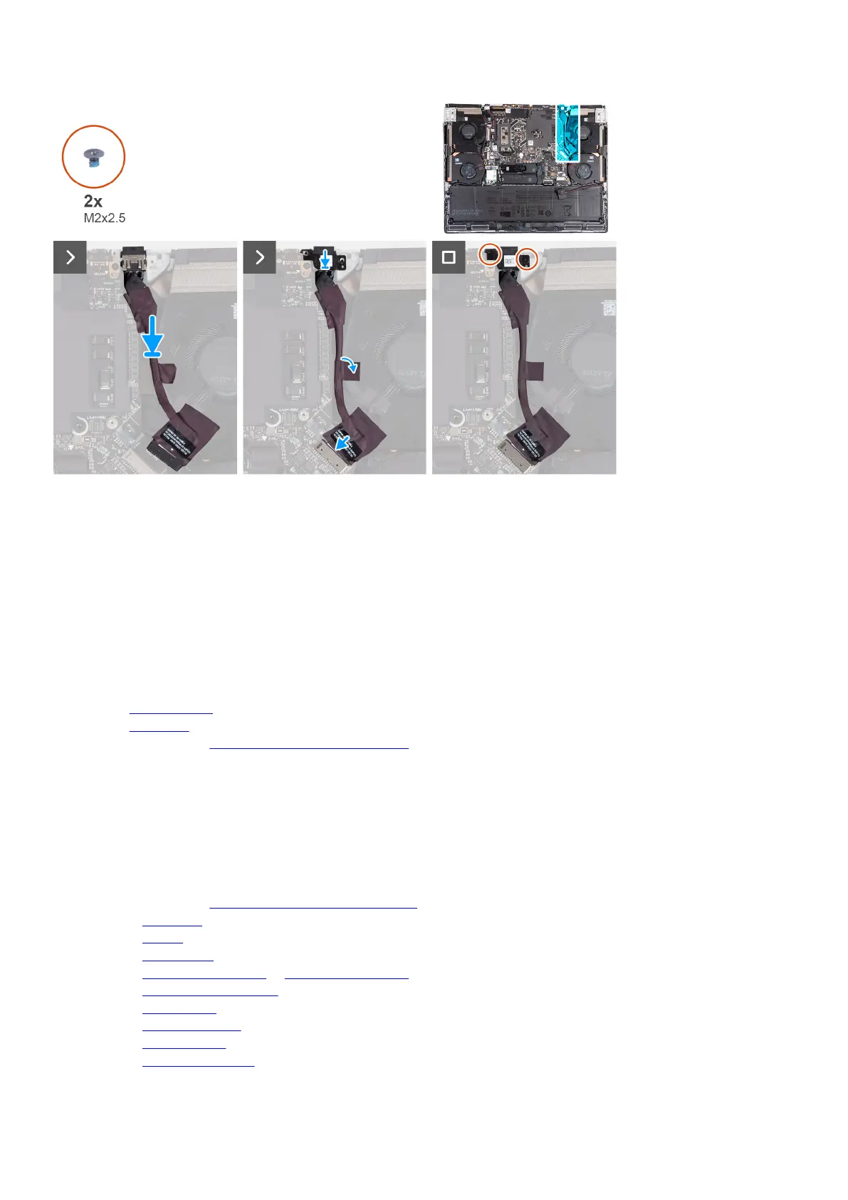 7. Replace the two screws (M2x2.5) that secure the power-adapter port bracket to the palm-rest and keyboard assembly.