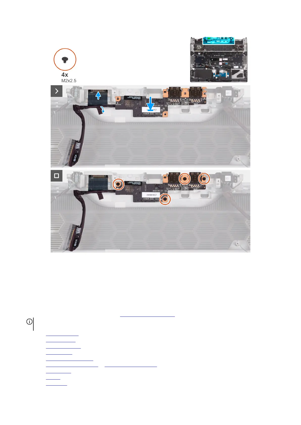 2. Replace the four screws (M2x2.5) that secure the I/O board to the palm-rest and keyboard assembly.