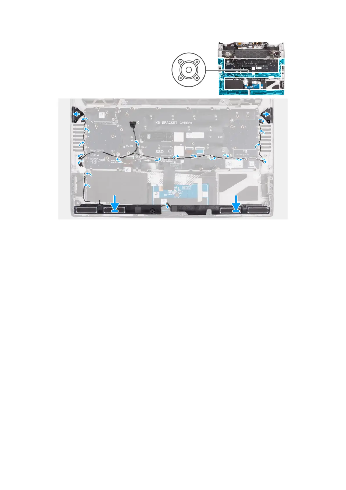 4. Route the speaker cable through the routing guides on the palm-rest and keyboard assembly as shown in the image.