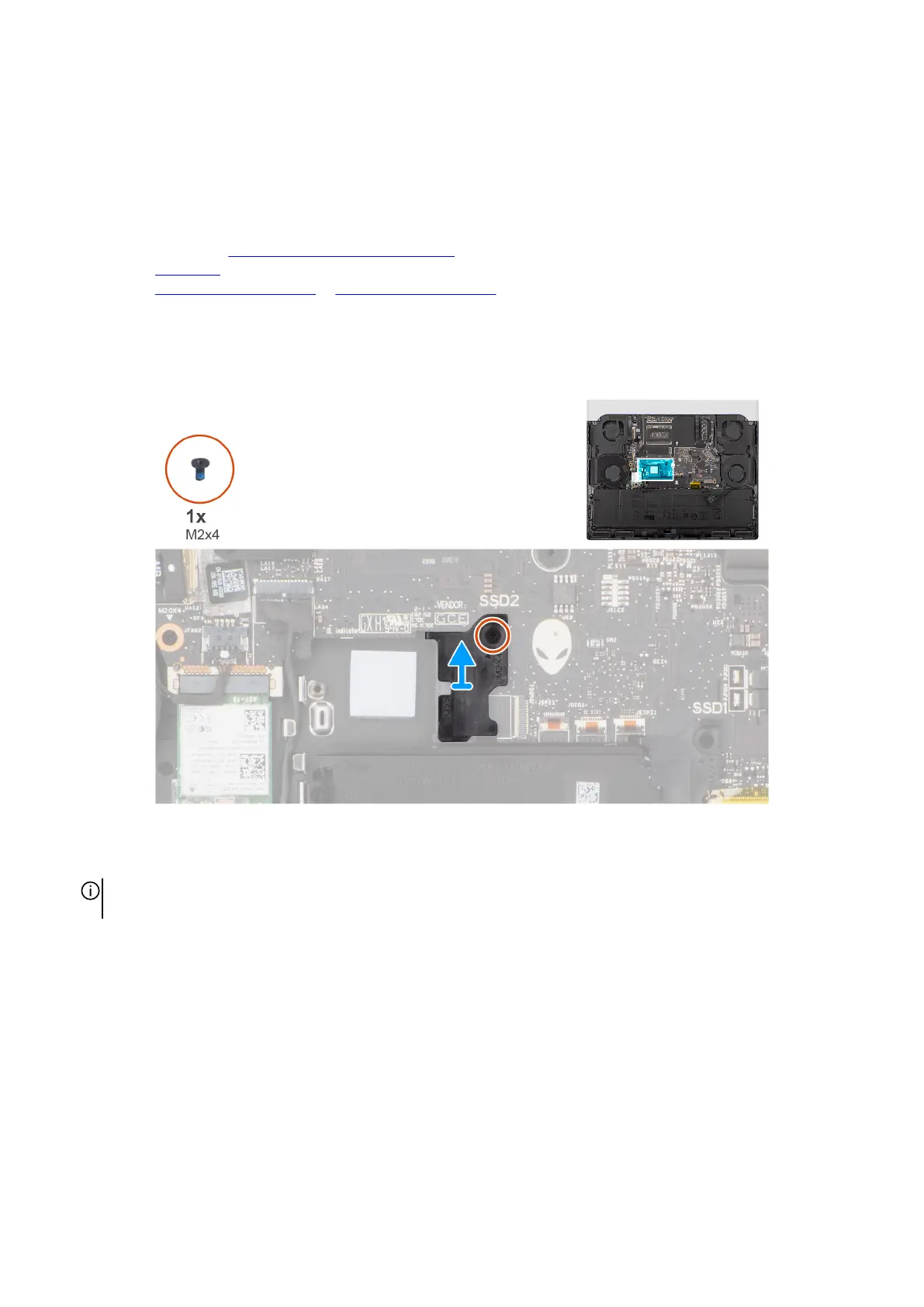 1. Remove the screw (M2x4) that secures the solid state drive bracket to the palm-rest and keyboard assembly.