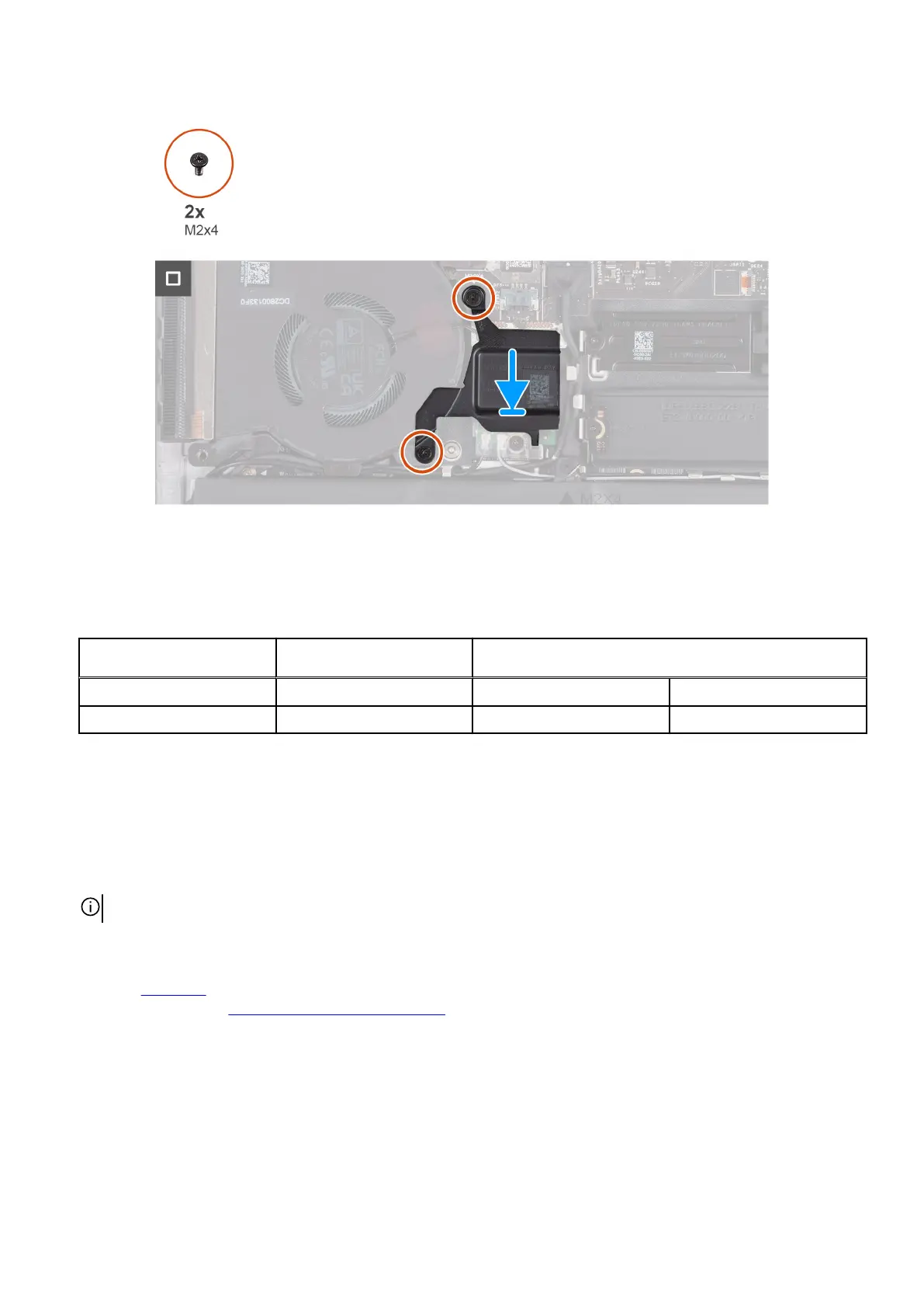 6. Replace the two screws (M2x4) that secures the wireless card thermal shield to the wireless card and palm-rest and keyboard