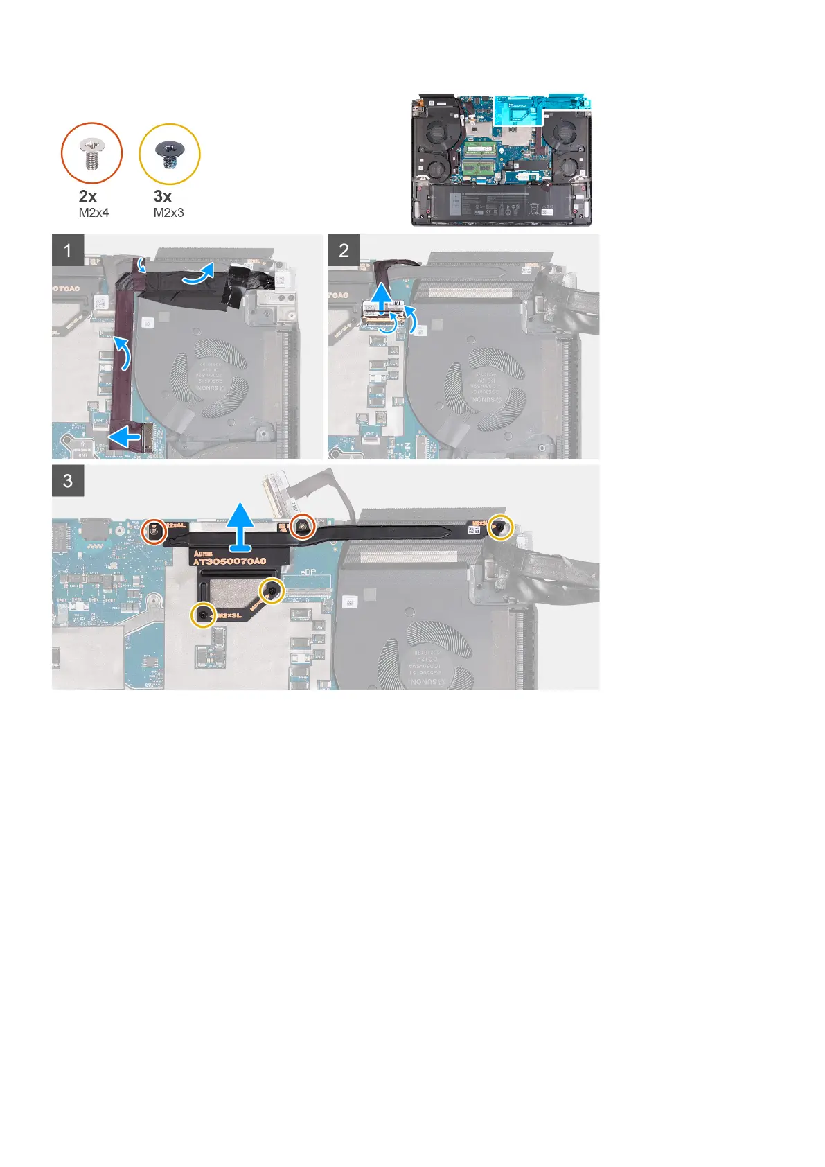 8. Remove the three screws (M2x3) that secure the heat pipe to the system boad.