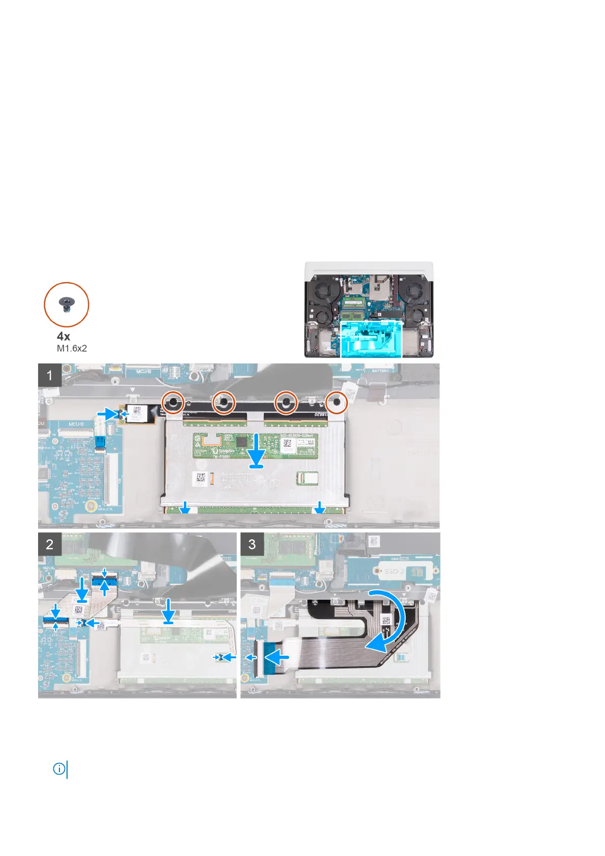 7. Remove the four screws (M1.6x2) that secure the touchpad assembly to the palm-rest and keyboard assembly.
