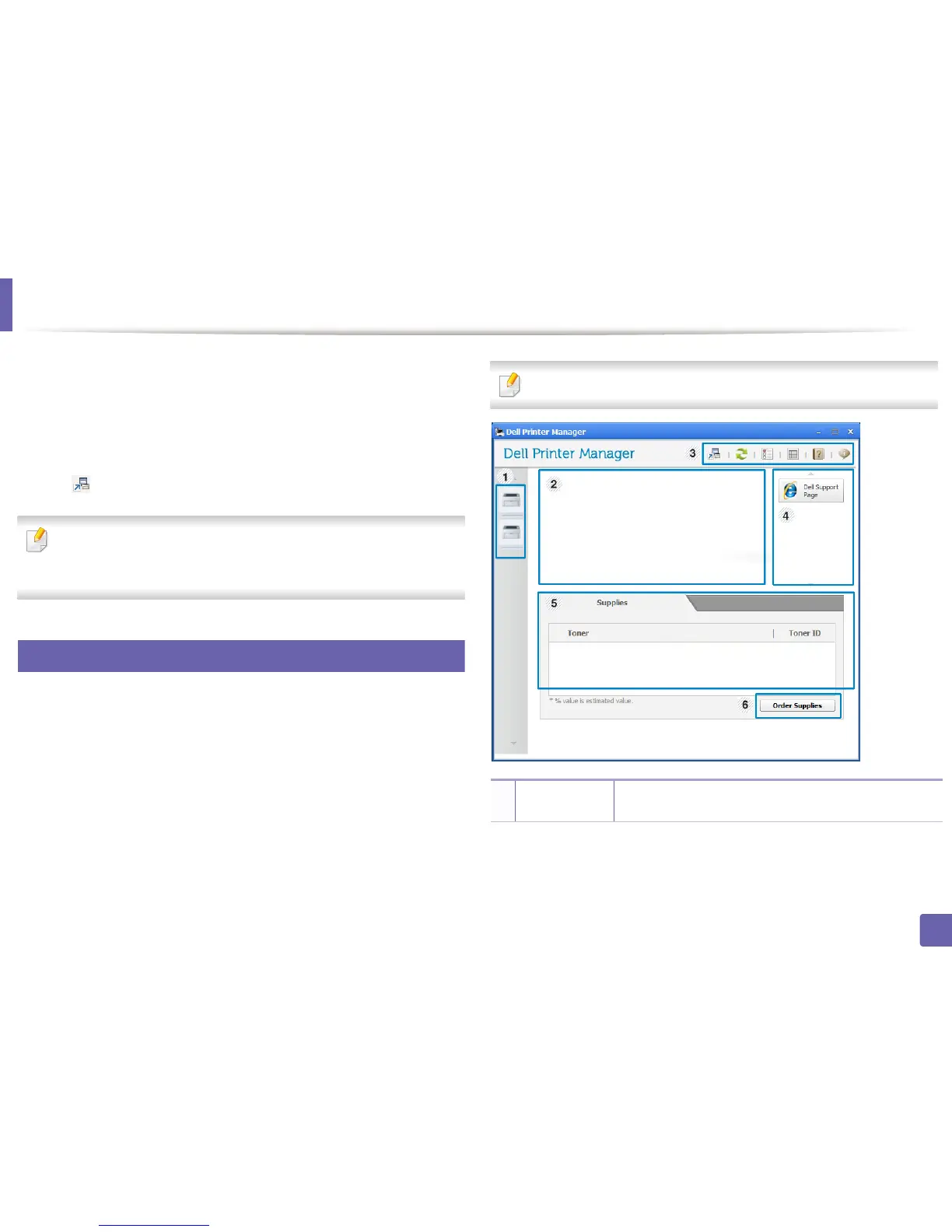The Dell Printer Manager interface is comprised of various basic sections as
