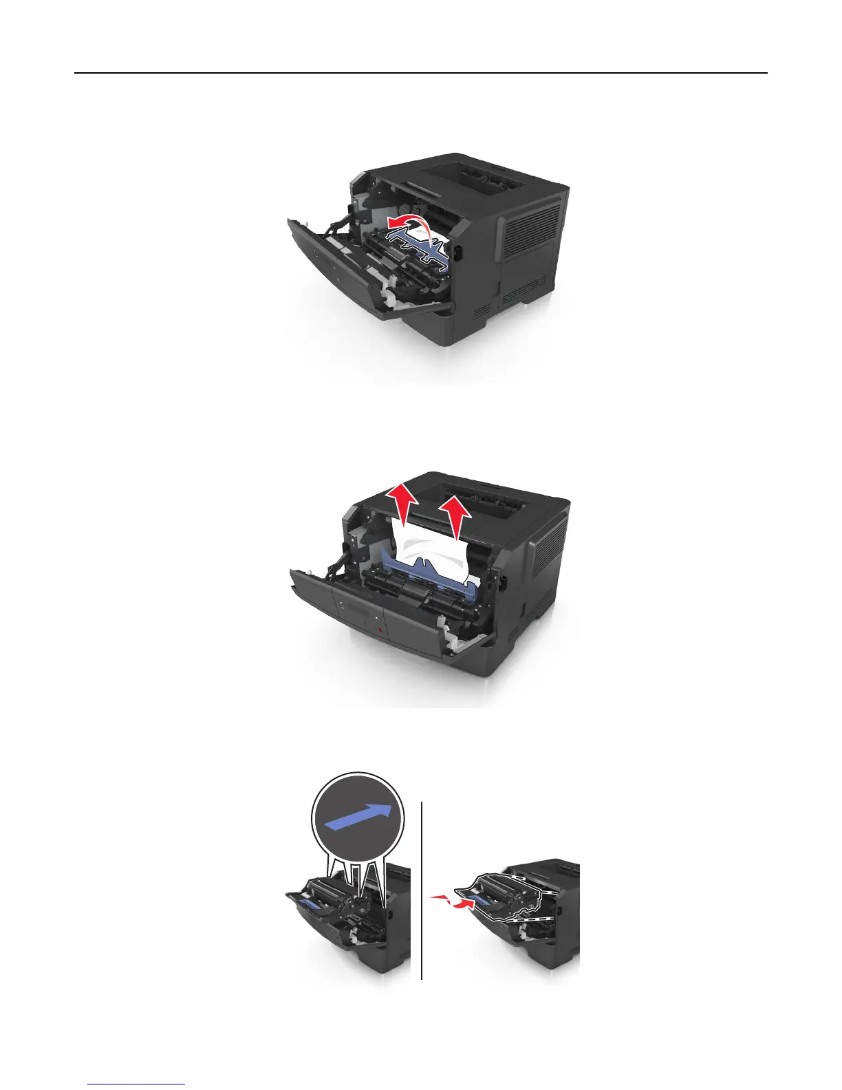 7 Insert the imaging unit by aligning the arrows on the side rails of the unit with the arrows on the side rails inside