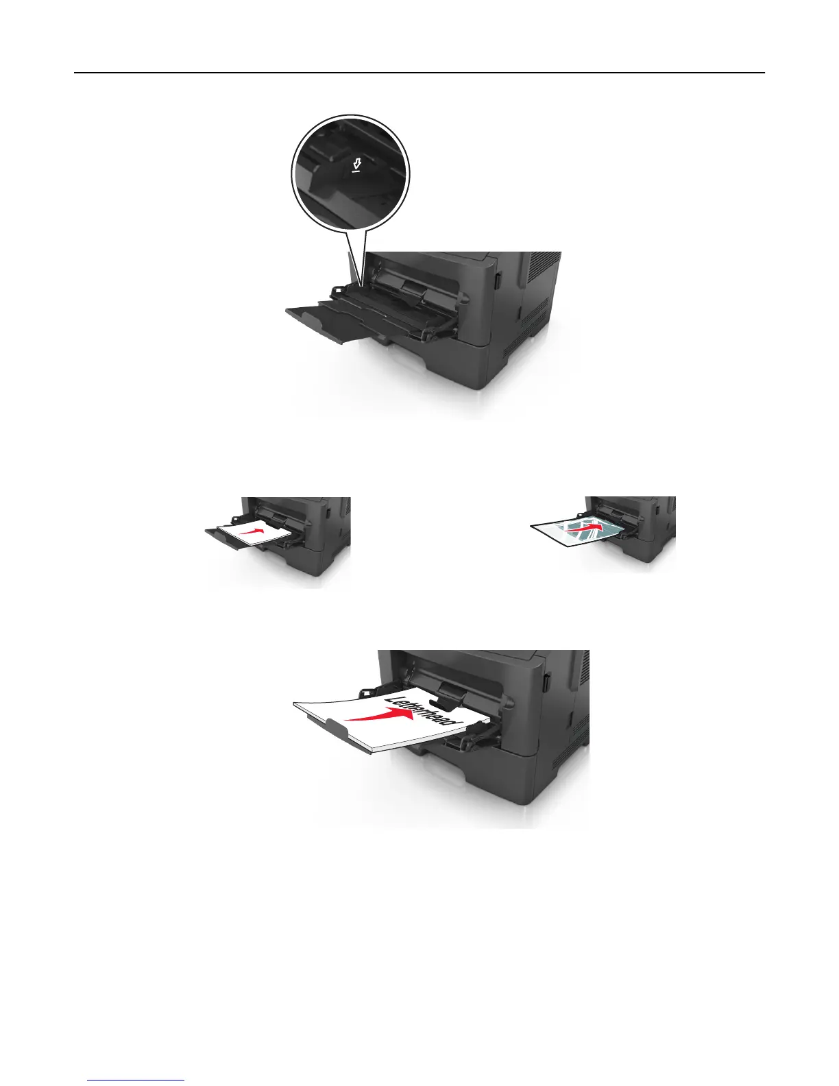 • Load letterhead faceup with the top edge entering the printer first. For two‑sided (duplex) printing, load