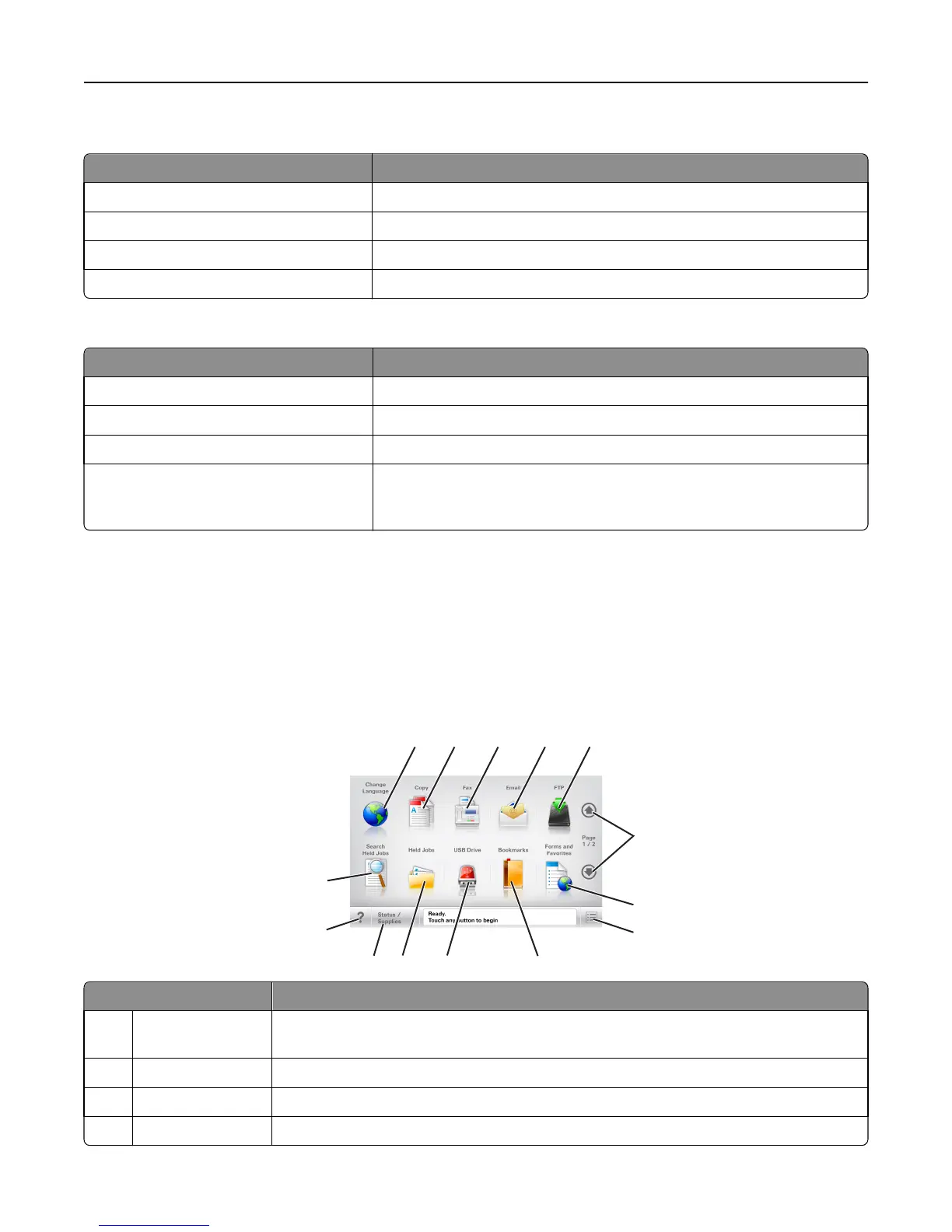 When the printer is turned on, the display shows a basic screen, referred to as the home screen. Touch the home screen