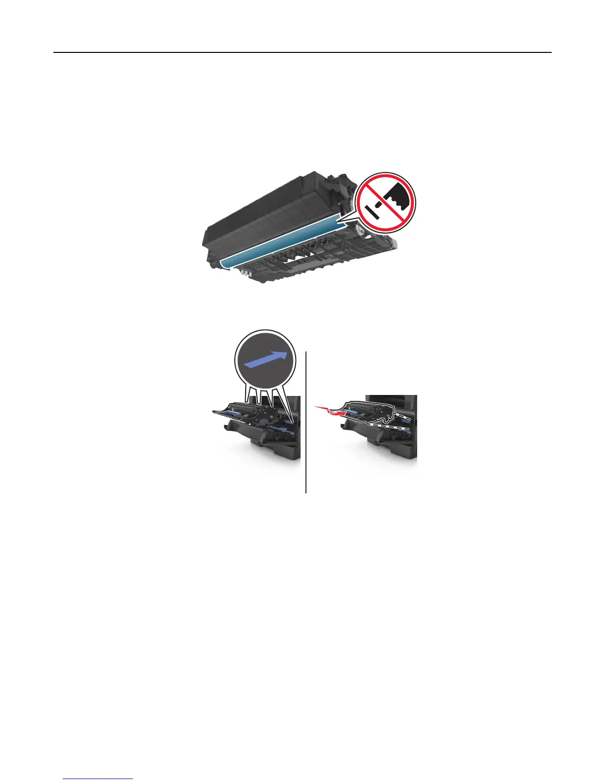 Warning—Potential Damage: Do not touch the photoconductor drum. Doing so may affect the print quality of