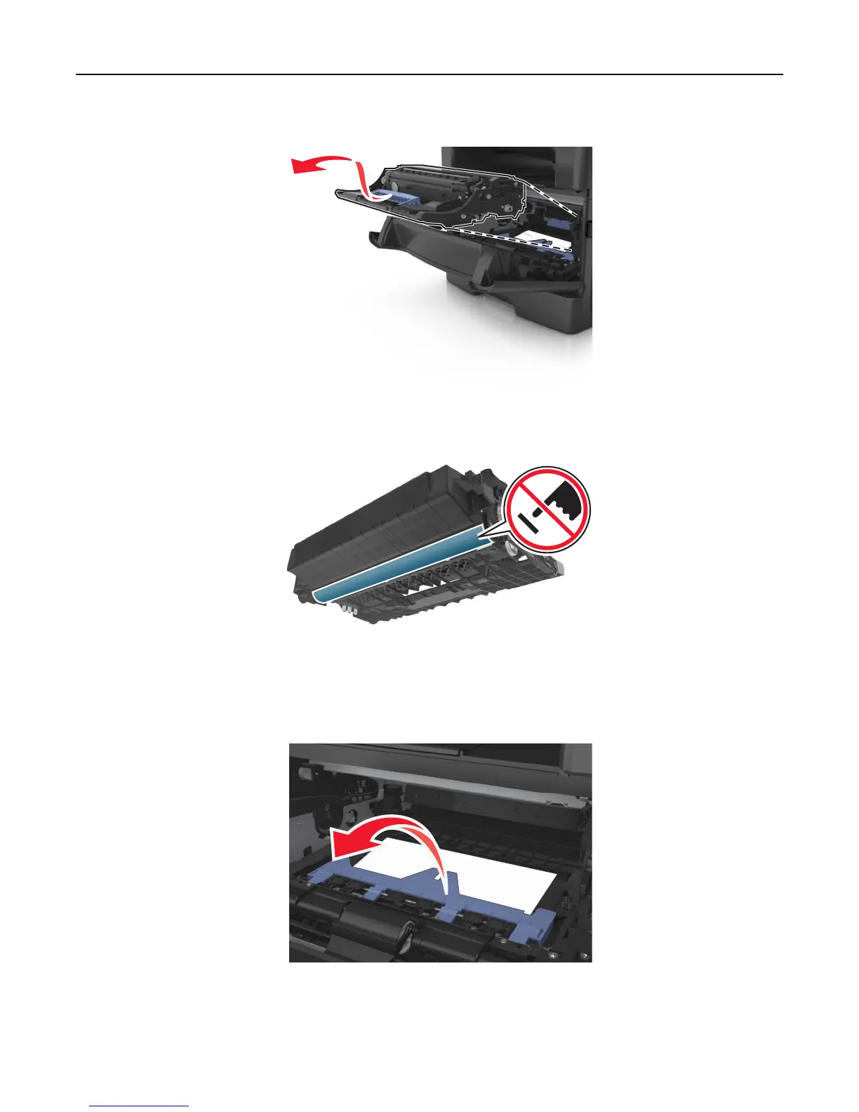 Warning—Potential Damage: Do not touch the shiny blue photoconductor drum under the imaging unit. Doing