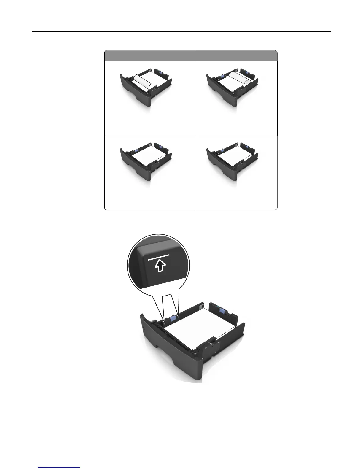 Make sure the paper is below the maximum paper fill indicator located on the side of the width guide. Overfilling