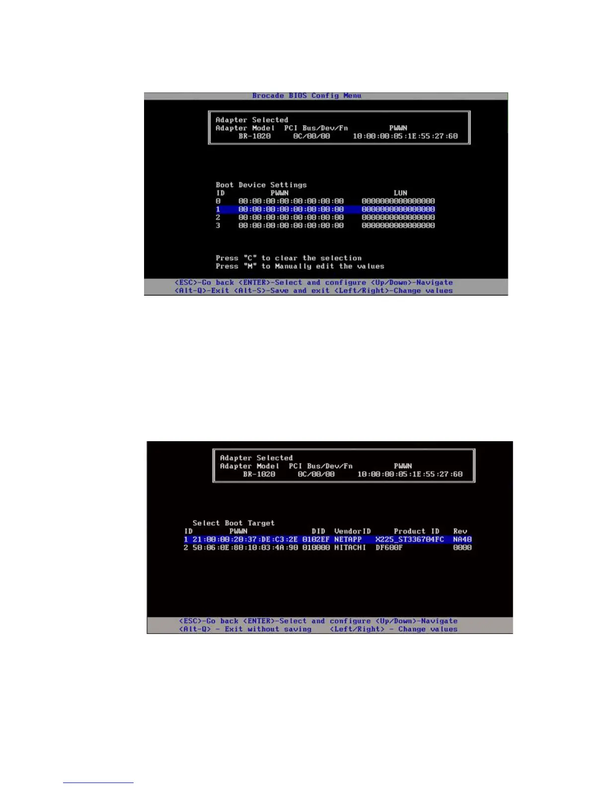 • Press M to manually edit boot device information, then enter the PWWN and LUN values