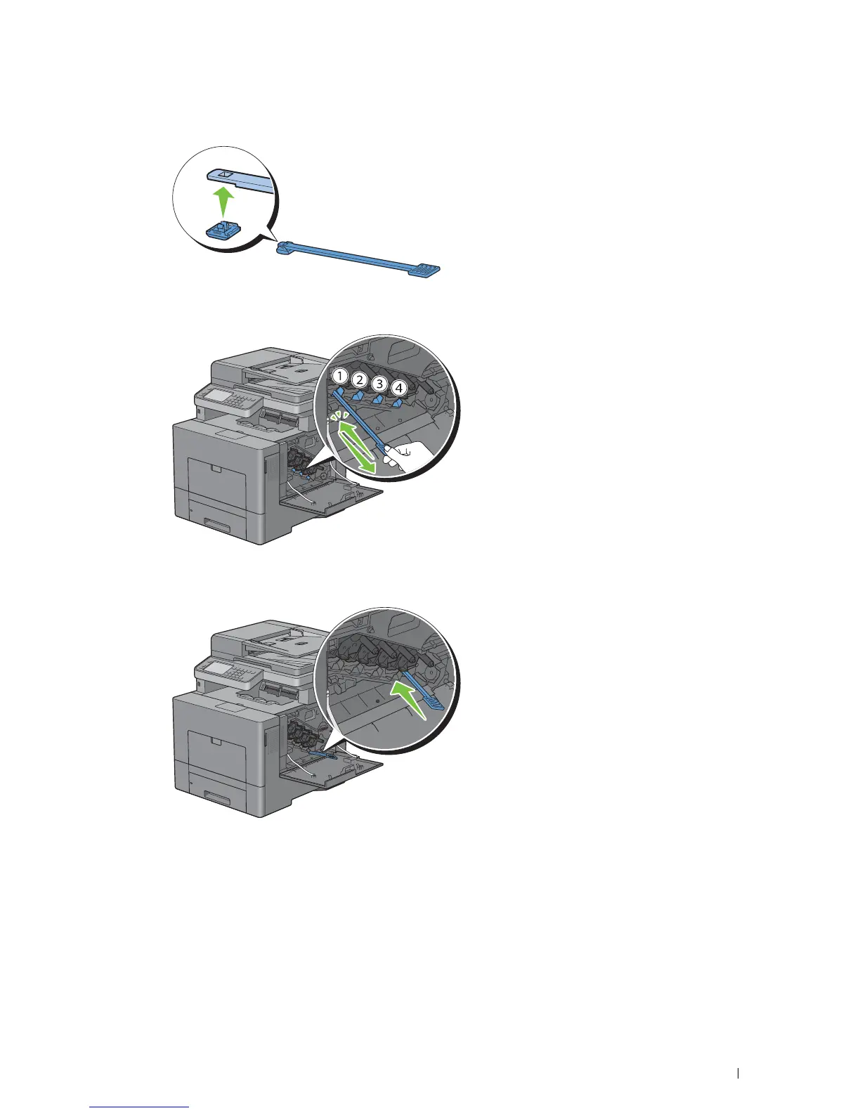 Insert the cleaning rod fully into one of the four holes until it clicks into the interior of the printer as illustrated