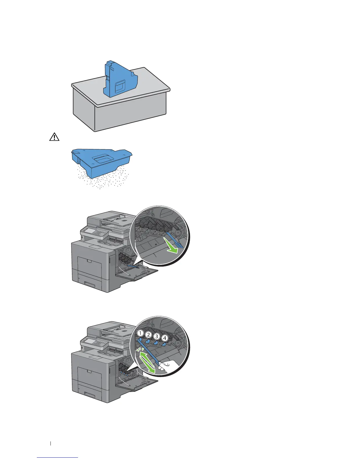 WARNING: Never lay the waste toner box on its side as this may cause its malfunction or toner spills.