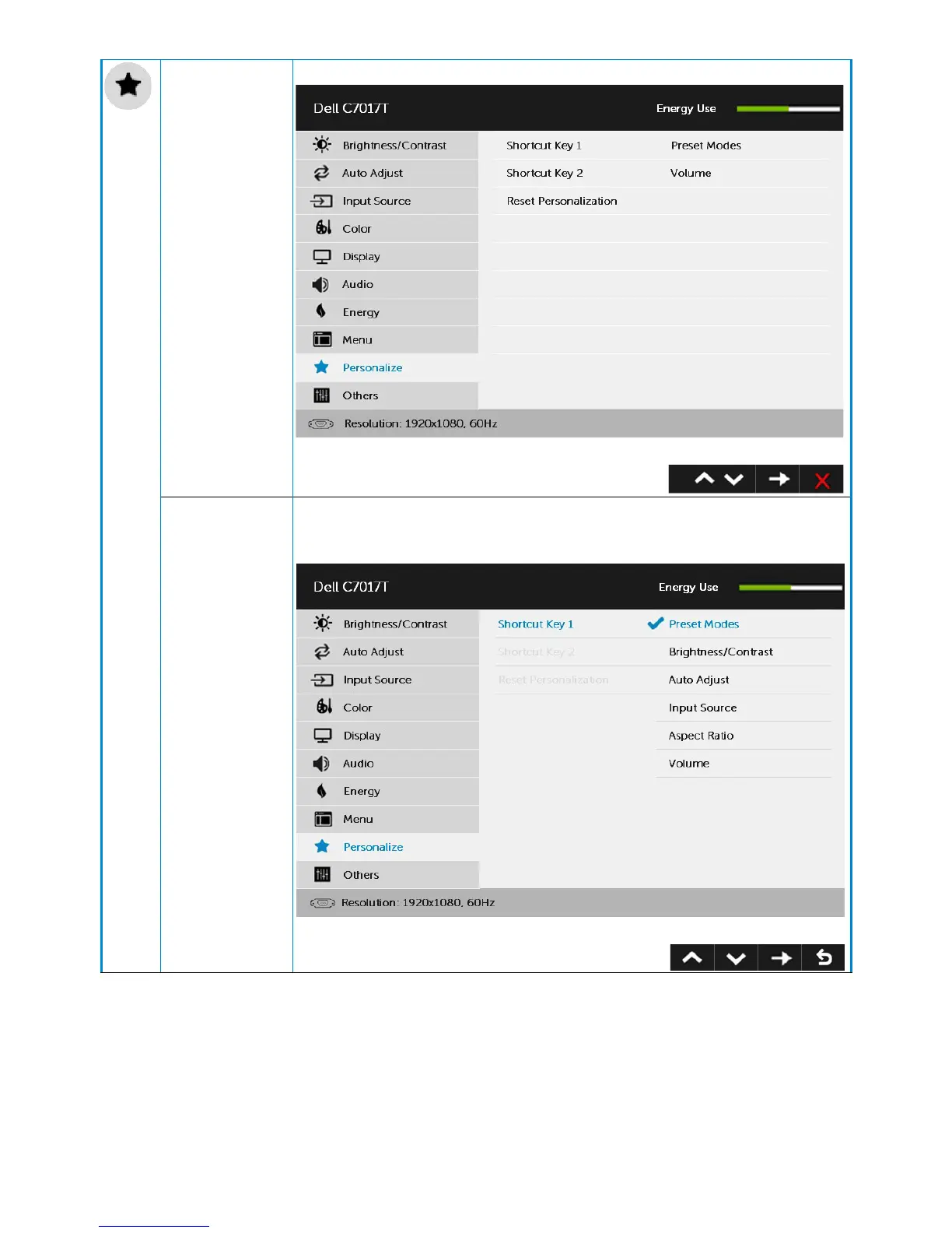 Personalize Selecting this option allows you to set two shortcut keys.
