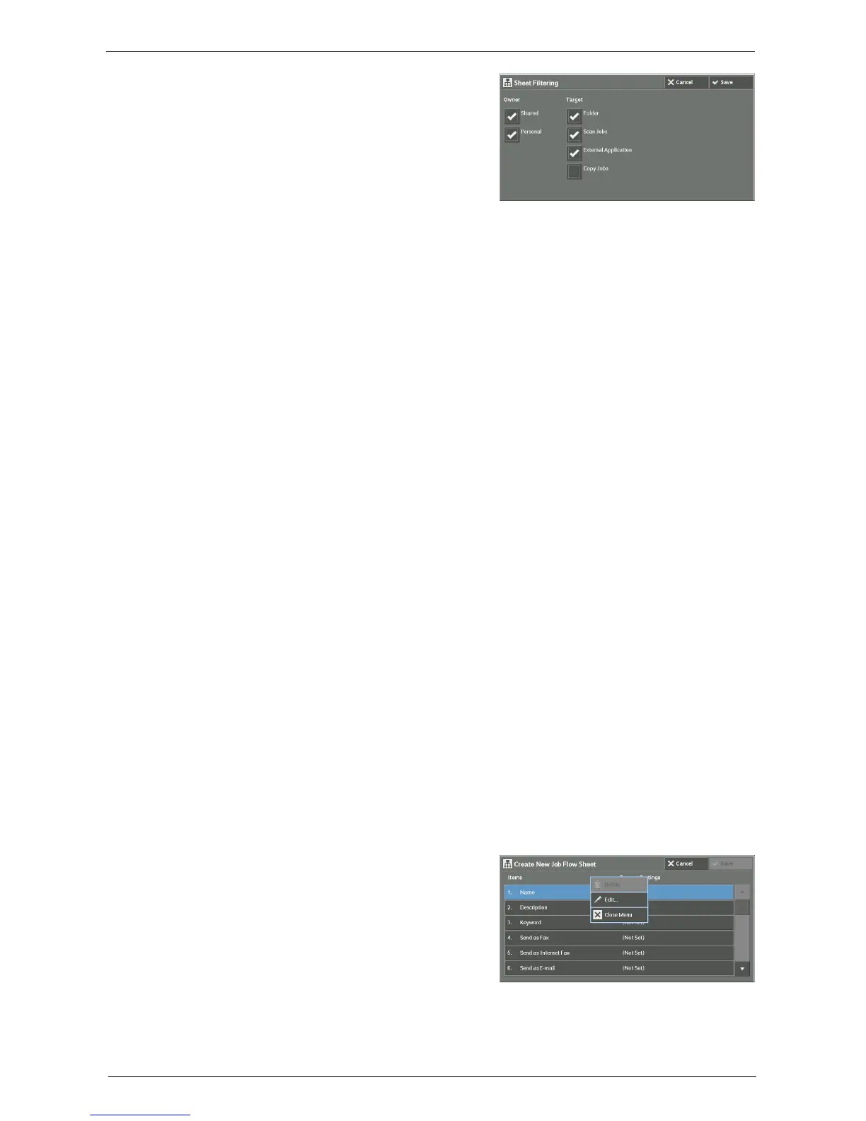 Filters job flow sheets by target, such as scan jobs and folders.