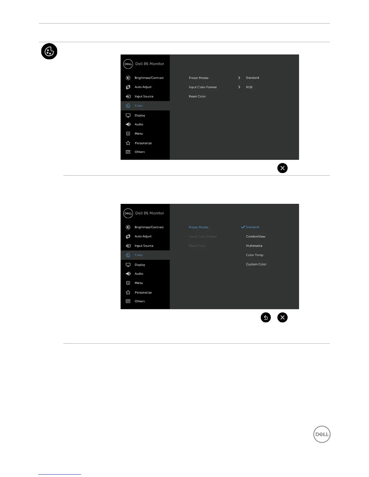 ComfortView, Multimedia, Color Temp., or Custom Color from