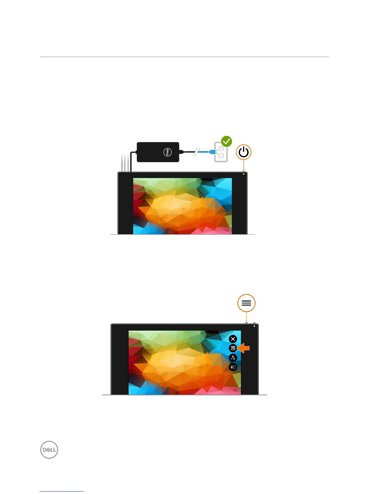 Press the power button to turn on the Dell Canvas 27. The white LED indicates the Dell