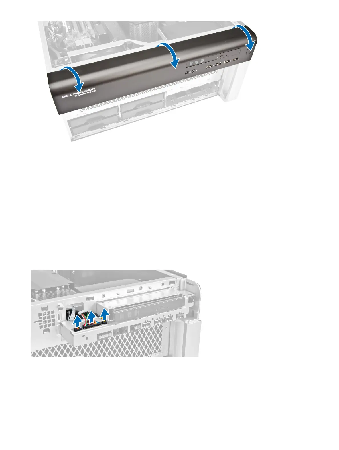 1 Insert the hooks along the bottom edge of the front panel into the slots on the chassis front.