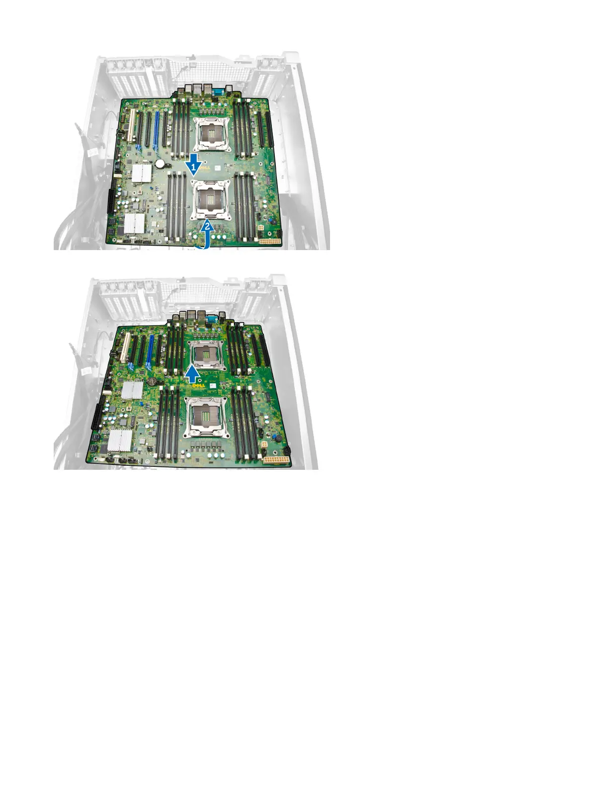 1 Align the system board to the port connectors on the back of the chassis and place the system board in the chassis.