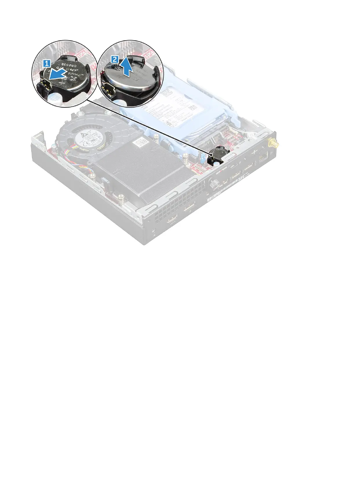 1. Hold the coin cell battery with the "+" sign facing up and slide it under the securing tabs at the positive side of the