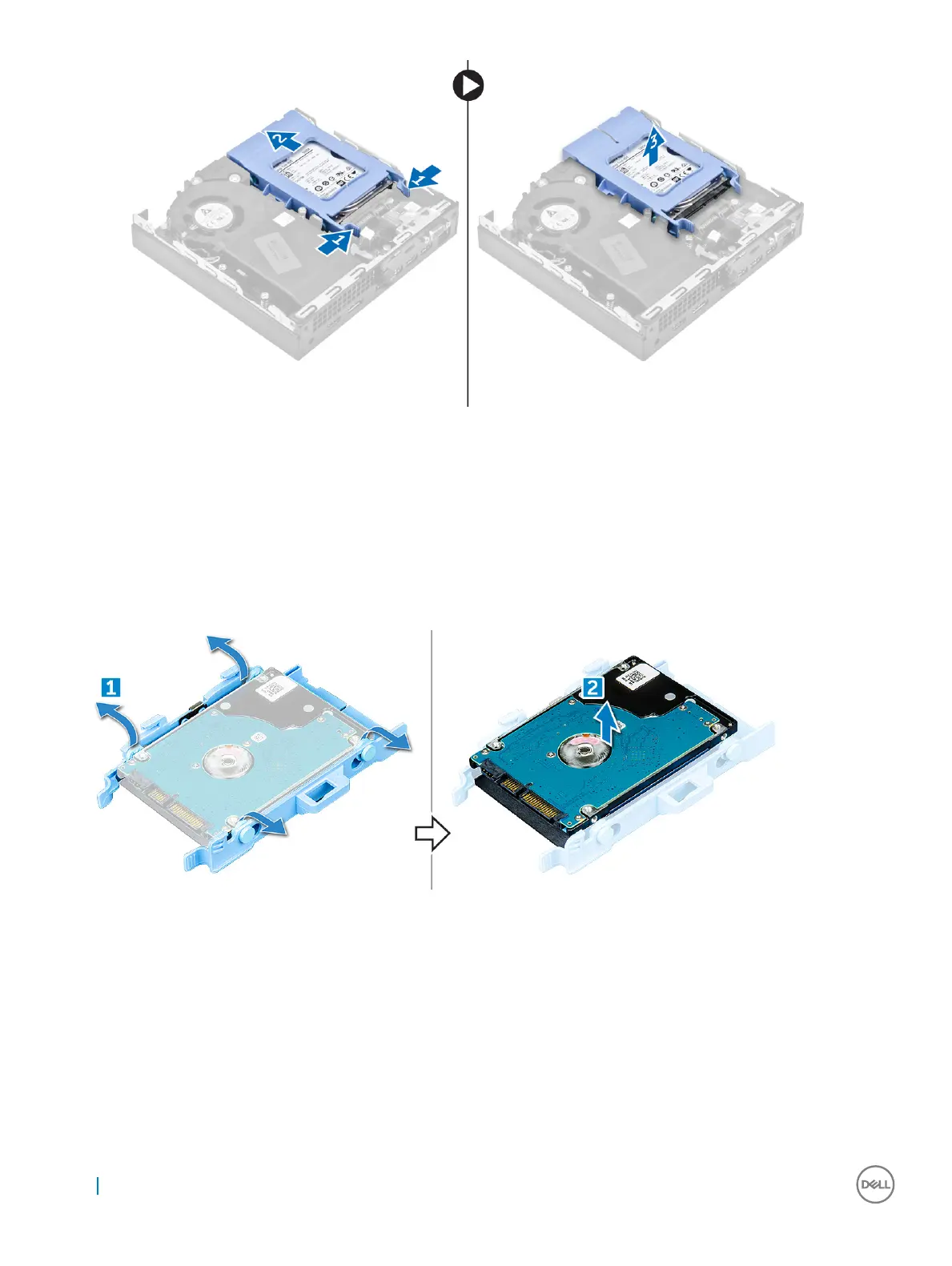 a Pull one side of the drive bracket to disengage the pins on the bracket from the slots on the drive [1] and lift the drive [2].