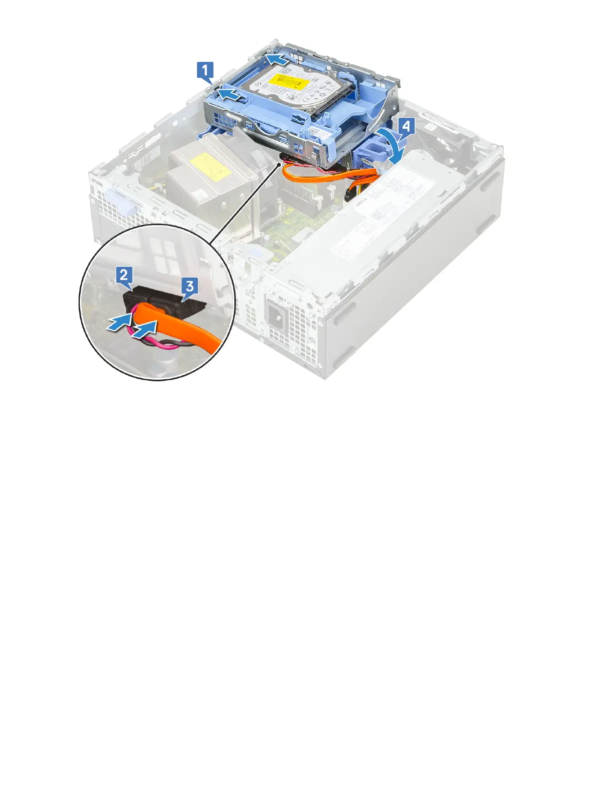 e Route the hard drive data and power cables through the HDD-ODD release tab [2].