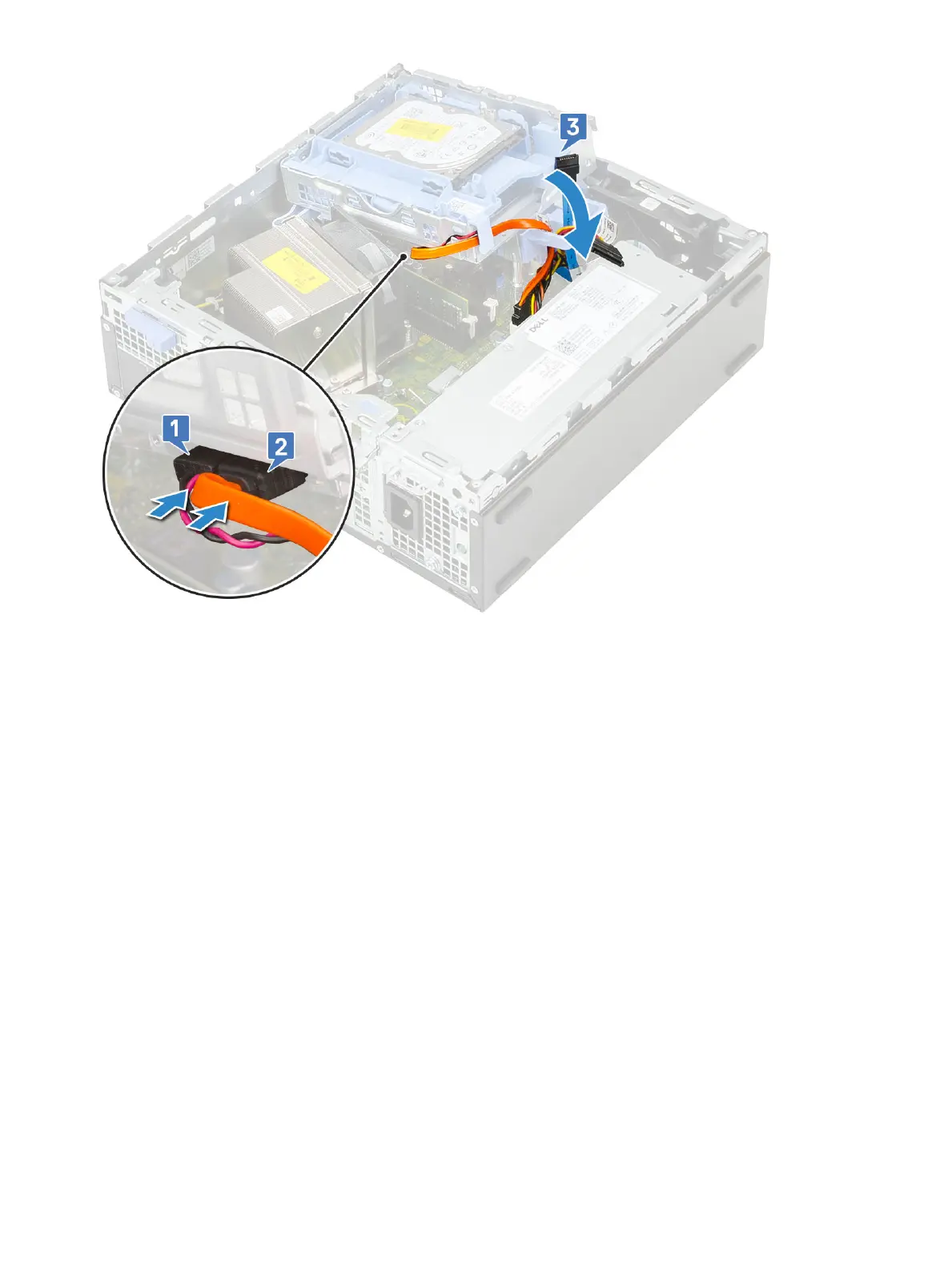 5 Connect the hard drive data cable and hard drive power cable to the connectors on the hard drive [1,2].